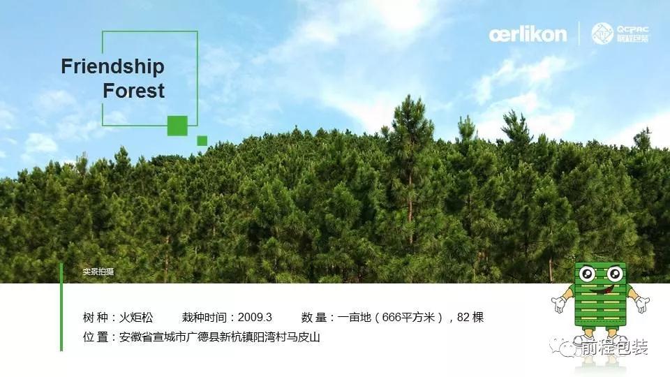 歐瑞康(Wuxi)與前程公司的友誼林位于安徽省廣德市前程東盛生態(tài)林業(yè)有限公司的林場內,林場現有土地總面積3000多畝,林場內有松樹林、竹林、水庫、茶園、山核桃園等;友誼林占地面積為一畝地(666平方米),82棵松樹,品種為火炬松,寓意著雙方的合作擁有更加美好的明天。