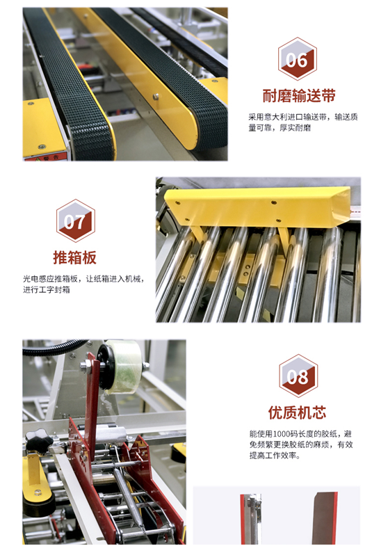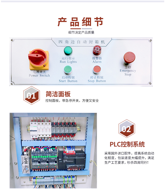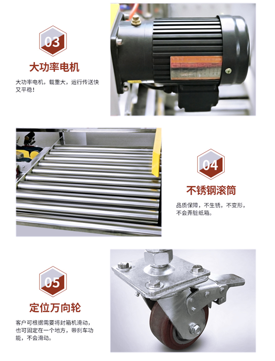 角邊封箱機紙箱經(jīng)前段封箱機中間上下封口后,進(jìn)入90度轉(zhuǎn)角機,由推箱板推入角邊封箱機,同時自動封紙箱上下四個角邊、撫平,快速、平穩(wěn)。